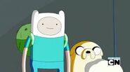 The guards return to a staff lounge for small talk. Jake shape-shifts into one of them, carrying Finn and BMO on his shoulders. BMO explains that if it can connect to one of the guards' ports, it can hack into its computer and find where the B port is. Jake plugs BMO into one of the guards, recovering a map to the B port, and then the three leap out of Jake's disguise. They re-board the tram, with the security guards in hot pursuit. They follow the map to the B port, falling off the tram and crashing through several floors before landing.