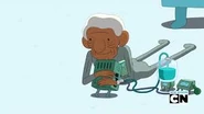 The security guards fall soon after, brandishing their vaporization guns at the three, before BMO explains, “I am not non-MO. I am BMO.” The guards gasp, and a voice asks, “BMO?” Finn, Jake and BMO look up to see a emaciated, atrophied old man, kept alive only by MOs. The man explains that he is Moe, the creator of the factory, as well as the creator of BMO. Moe assures Finn and Jake that he will not reset BMO's personality. Moe explains that he originally built BMO to take care of his son, but since he never had a son, he sent BMO off into the world alone, hoping that it could find a family of its own, maybe even find somebody else's little boy to take care of. Although he claims to have built a million robots, Moe says that BMO is very special: he built BMO to understand fun and how to play. He built BMO to be more - this is BMO's namesake. CMO hands Moe a back-up drive disk, which heals BMO. BMO awakens and runs up to hug Moe. Jake points out that although Moe claimed to have made millions of robots, he and Finn had only seen the receptionist and the security guards. Moe then leads them to a hatch, which opens to reveal a populous and diverse ecosystem of robots. Moe tells BMO to say hi to its family, and BMO immediately does. The other MOs say hi back to BMO, and BMO slaps its screen in happiness. The episode then ends.