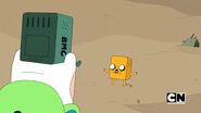 Finn and Jake prop BMO up on some cushions. BMO, stuttering, explains that it needs to install new core system drivers, which they can find at the MO factory in the Bad Lands, where BMO was born. BMO leads Finn and Jake there, but warns them that damaged MOs get full memory wipes before they are repaired, and it makes Finn and Jake promise not to let this happen to it. BMO then explains that only MOs are allowed in the factory. Jake shape-shifts into a MO, and Finn pretends to be a MO by stuffing his head and arms into his shirt, using BMO as his head.