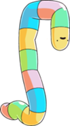 Wormo is long and multi colored worm. His colors are yellow, green, red and blue. His face is simple, like most characters.